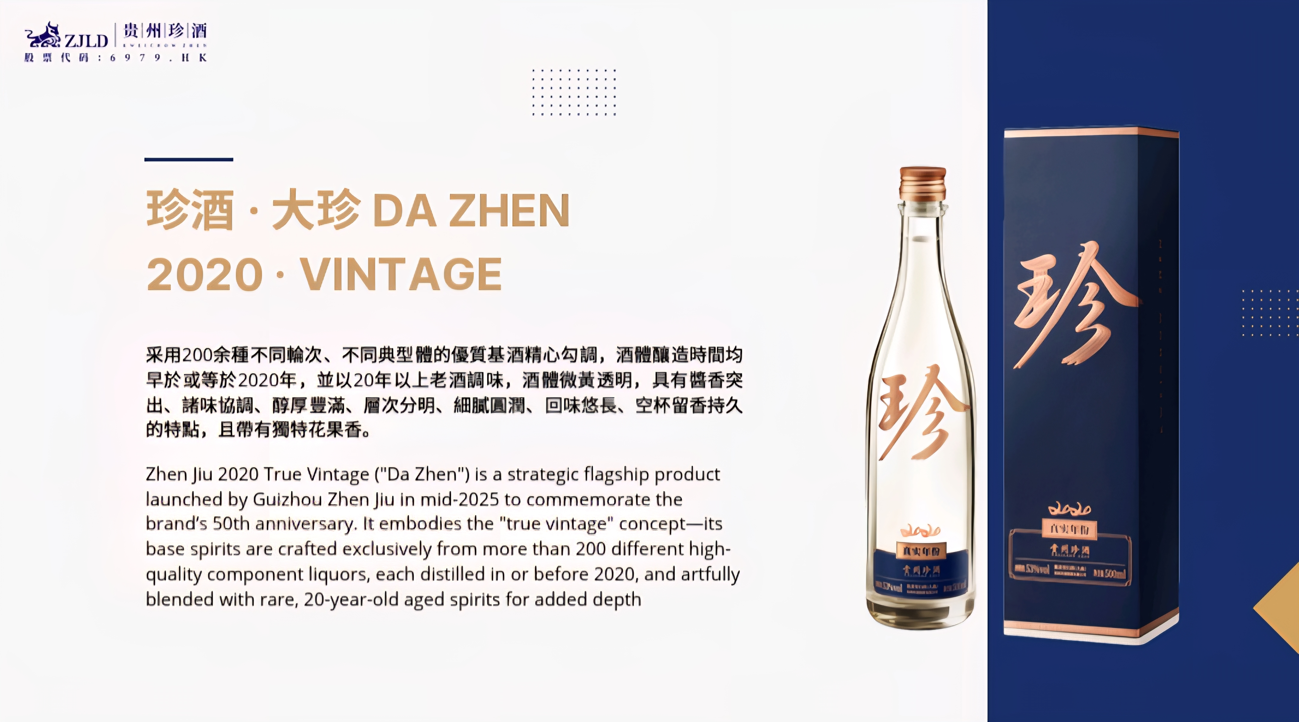 | 제품설명 | 라오전지우(Laozhenjiu) 라오전지우는 고품질 수수, 밀, 물로 빚었습니다. 전통적인 장향(酱香) 바이주 양조 공정과 고체 발효 방식을 사용하며, 어떠한 향료(향미 첨가물) 도 첨가하지 않습니다. 부드럽고 우아한 장향이 느껴지고, 향이 조화로우며, 여운이 길게 남습니다. 귀주 진 시리즈(Kweichow Zhen Series) 의 주력 제품입니다. 구이저우 전주(贵州珍酒) 서로 다른 증류 차수와 전형(典型) 스타일의 우수한 기주(基酒) 200여 종을 엄선해 정성껏 블렌딩했습니다. 술의 양조(증류) 시점은 모두 2020년 이전 또는 2020년이며, 20년 이상 숙성한 원주로 맛을 더했습니다. 술빛은 옅은 황색의 투명한 색을 띠고, 장향(酱香)이 두드러지며 여러 풍미가 조화롭습니다. 풍부하고 두터운 질감, 또렷한 층위, 섬세하고 둥근 맛, 긴 여운, 빈 잔에서도 오래 남는 향이 특징이며, 독특한 꽃·과일 향을 동반합니다. **전주 2020 트루 빈티지(“대진”)**는 브랜드 50주년을 기념하기 위해 2025년 중반 구이저우 전주가 출시한 전략적 플래그십 제품입니다. “트루 빈티지” 콘셉트를 구현했으며, 2020년 이전 또는 2020년에 증류한 200여 종의 고급 구성 원주만을 사용해 베이스 스피릿을 만들고, 깊이를 더하기 위해 희소한 20년 숙성 원주를 정교하게 블렌딩했습니다. |